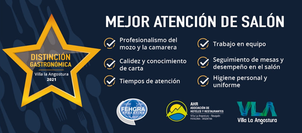 Con la “Distinción gastronómica de Villa La Angostura”, buscan incentivar a los propietarios a mejorar y elevar el nivel de atención que prestan al turista. Esta distinción amplía los puntos de observación claves del servicio no sólo enfocado en la oferta de cocina específicamente, sino que incorpora variables como Mejor atención de salón, Cliente Seguro, Mejores servicios