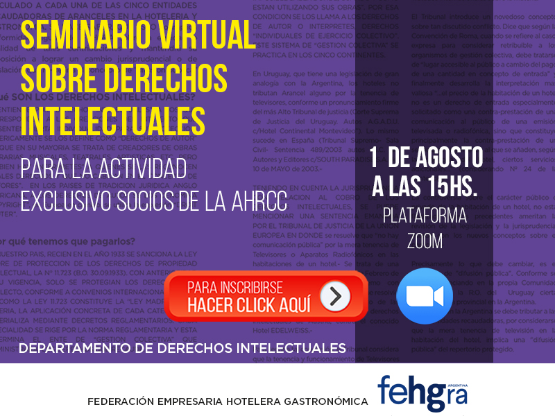 Destinado a empresarios hoteleros y gastronómicos socios de la Asociación de Hoteles, Restaurantes, Confiterías y Cafés (AHRCC) de la Ciudad de Buenos Aires, el Seminario Virtual sobre Derechos Intelectuales estará encabezado por Alejandro Moroni; la vicepresidente de la AHRCC, Gabriela Akrabian; la presidente de la Cámara de Hoteles de la AHRCC, Alejandra Rodríguez Díaz; el dirigente Pablo Ortiz, del Departamento de Derechos Intelectuales; y el asesor de la Federación Gerardo Dent. El encuentro tiene la finalidad de explicar sobre la normativa vigente en la materia, analizar las situaciones propias de la jurisdicción, y responder consultas de los asistentes.