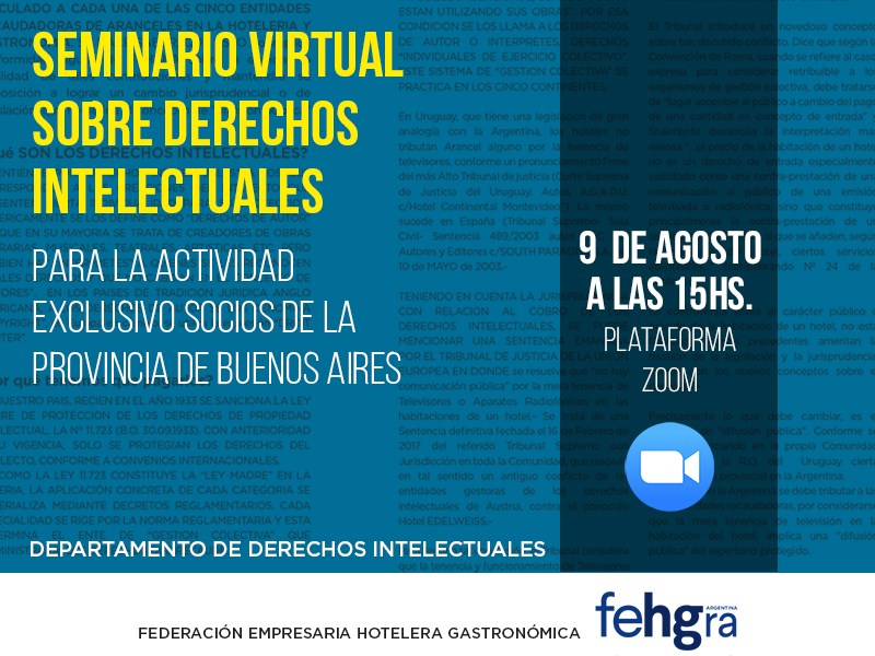 Destinado a empresarios hoteleros y gastronómicos socios de las entidades asociadas en la Provincia de Buenos Aires, el Seminario Virtual sobre Derechos Intelectuales estará encabezado por Alejandro Moroni; el coordinador regional, Ignacio Serra; los dirigentes del Departamento de Derechos Intelectuales, Pablo Ortiz y Ricardo Abajo; y el asesor de la Federación Gerardo Dent. El encuentro tiene la finalidad de explicar sobre la normativa vigente en la materia, analizar las situaciones propias de la jurisdicción, y responder consultas de los asistentes.