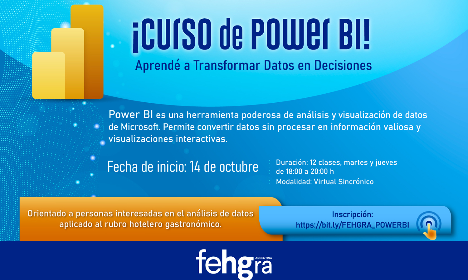 Ya está abierta la inscripción, a través del siguiente enlace: https://bit.ly/FEHGRA_POWERBI. Organizado en modalidad Virtual Sincrónico, la cursada inicia el 15 de octubre. Tiene una duración de 12 clases, a través de la plataforma Zoom – martes y jueves de 18:00 a 20:00 h-. Los cupos se cubrirán por orden de llegada. La inscripción será confirmada por correo electrónico al participante, una vez validados todos los procesos.