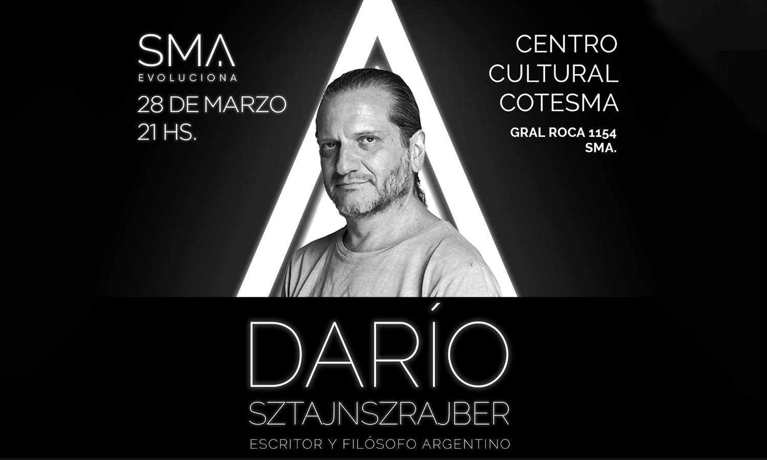 El escritor y filósofo argentino Darío Sztajnszrajber abrirá el Ciclo de Charlas de Evolución Sostenible “SMA Evoluciona” el 28 de marzo a las 21 hs, en el Centro Cultural Cotesma en San Martín de los Andes.