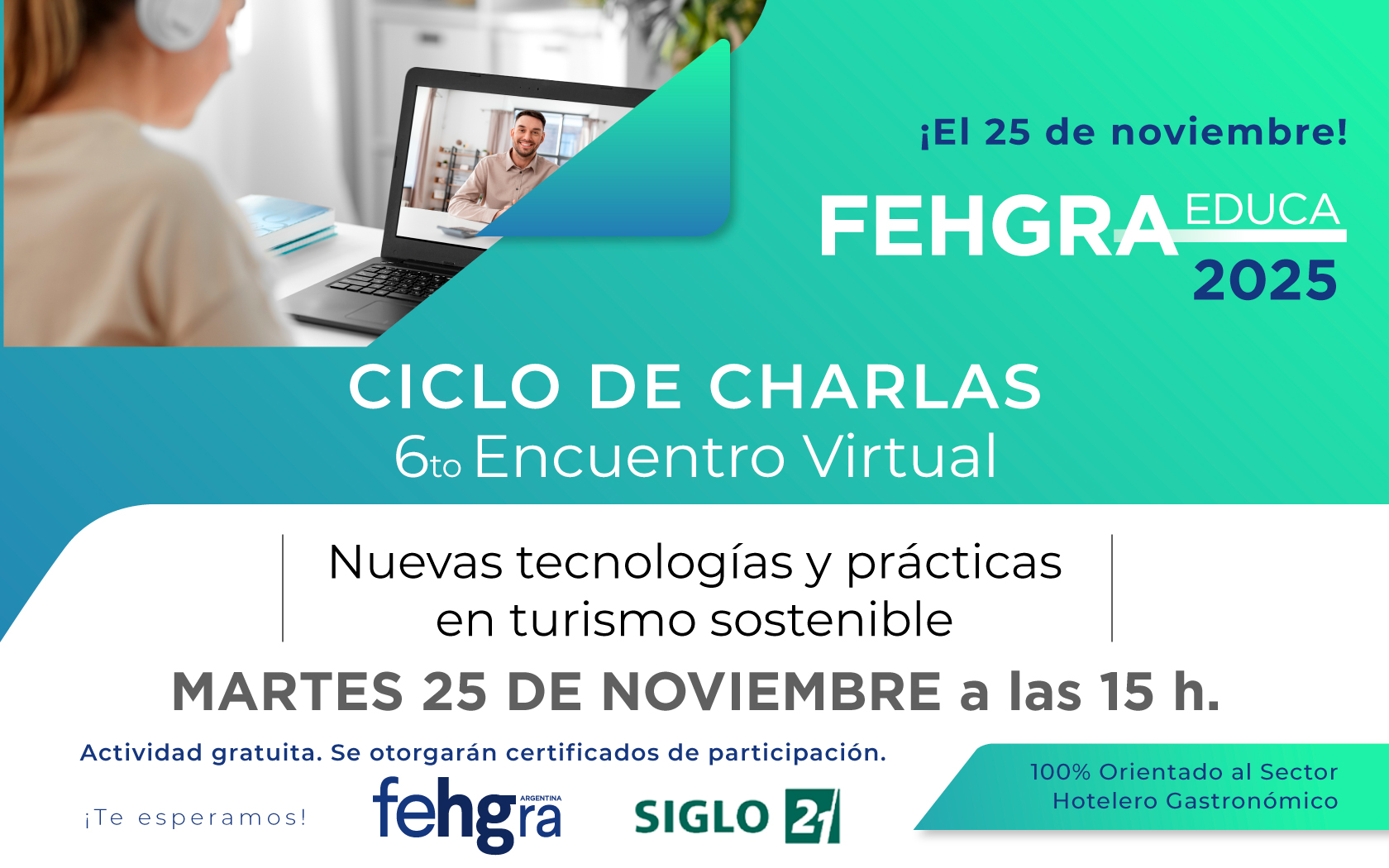 El Ciclo de Charlas FEHGRA Educa se encuentra en su etapa final y concluirá la edición 2025 con la sexta capacitación virtual gratuita, que se llevará a cabo el próximo martes 25 de noviembre, a las 15 h, bajo el título “Nuevas tecnologías y prácticas en turismo sostenible”. La actividad es organizada en conjunto con la Universidad Siglo 21.